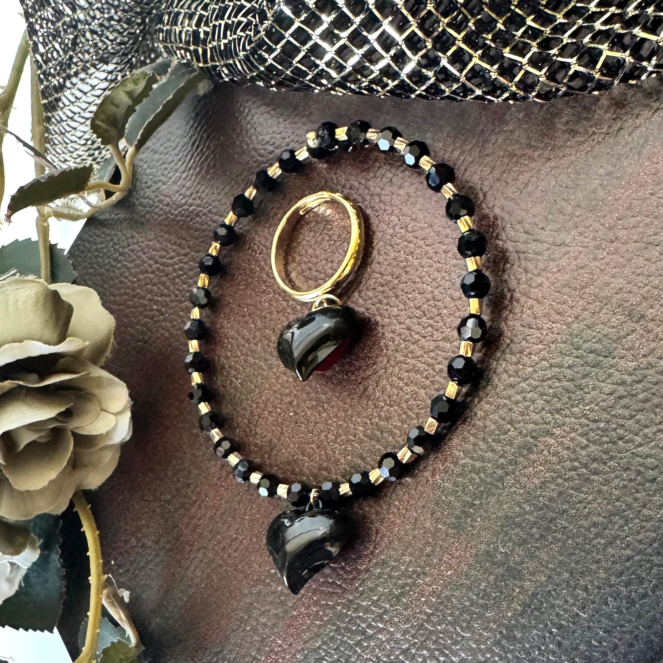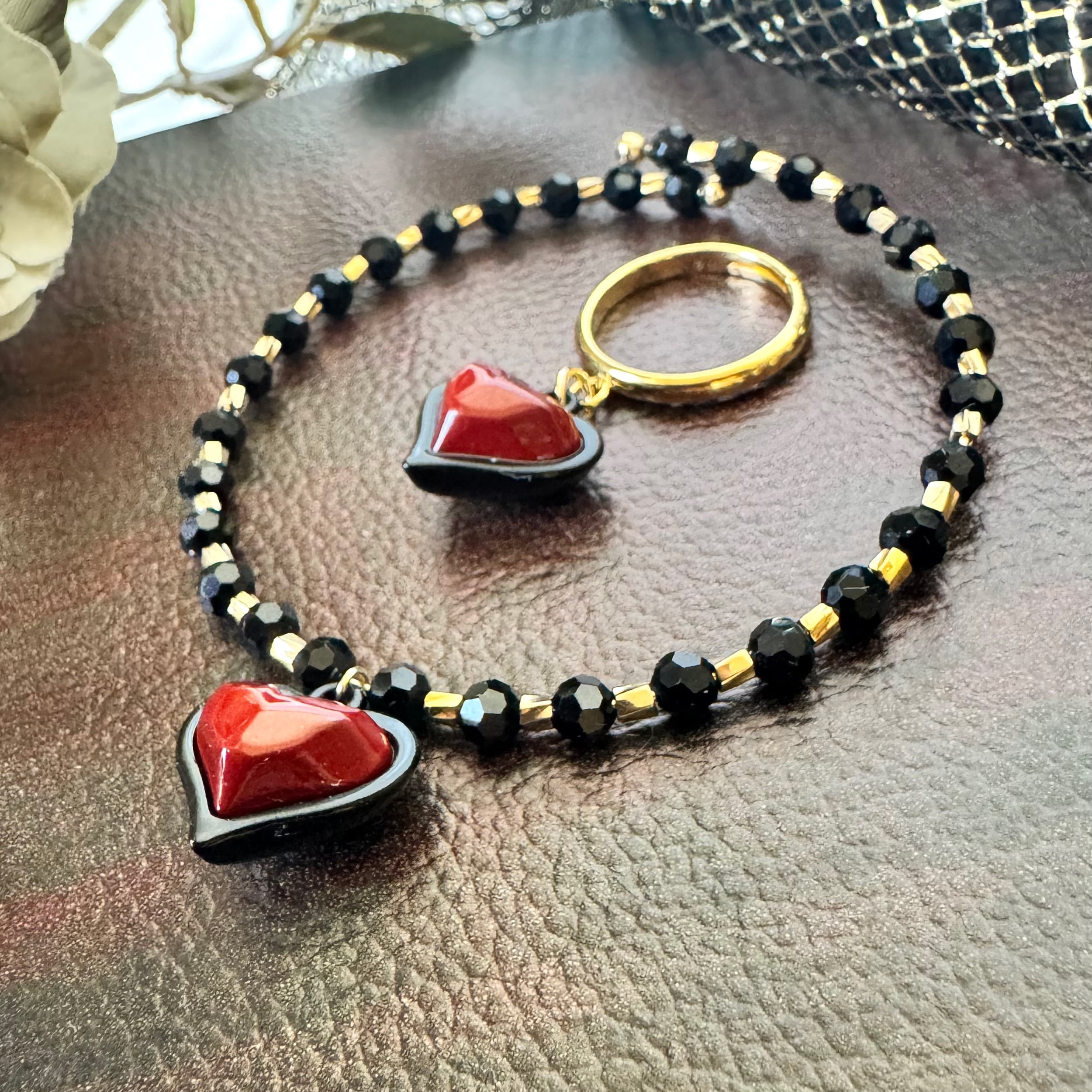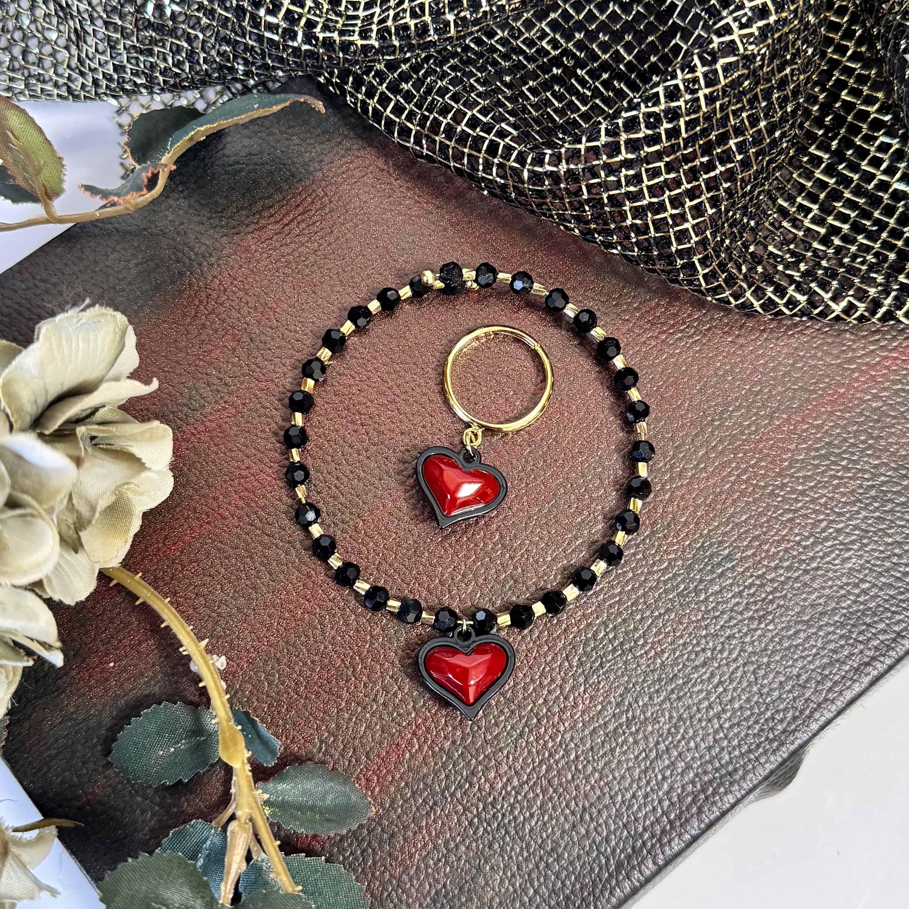 両面で使えるハートチャームを使ったピアス(イヤリング変更可)・ブレスレット・リングの3点セットです。