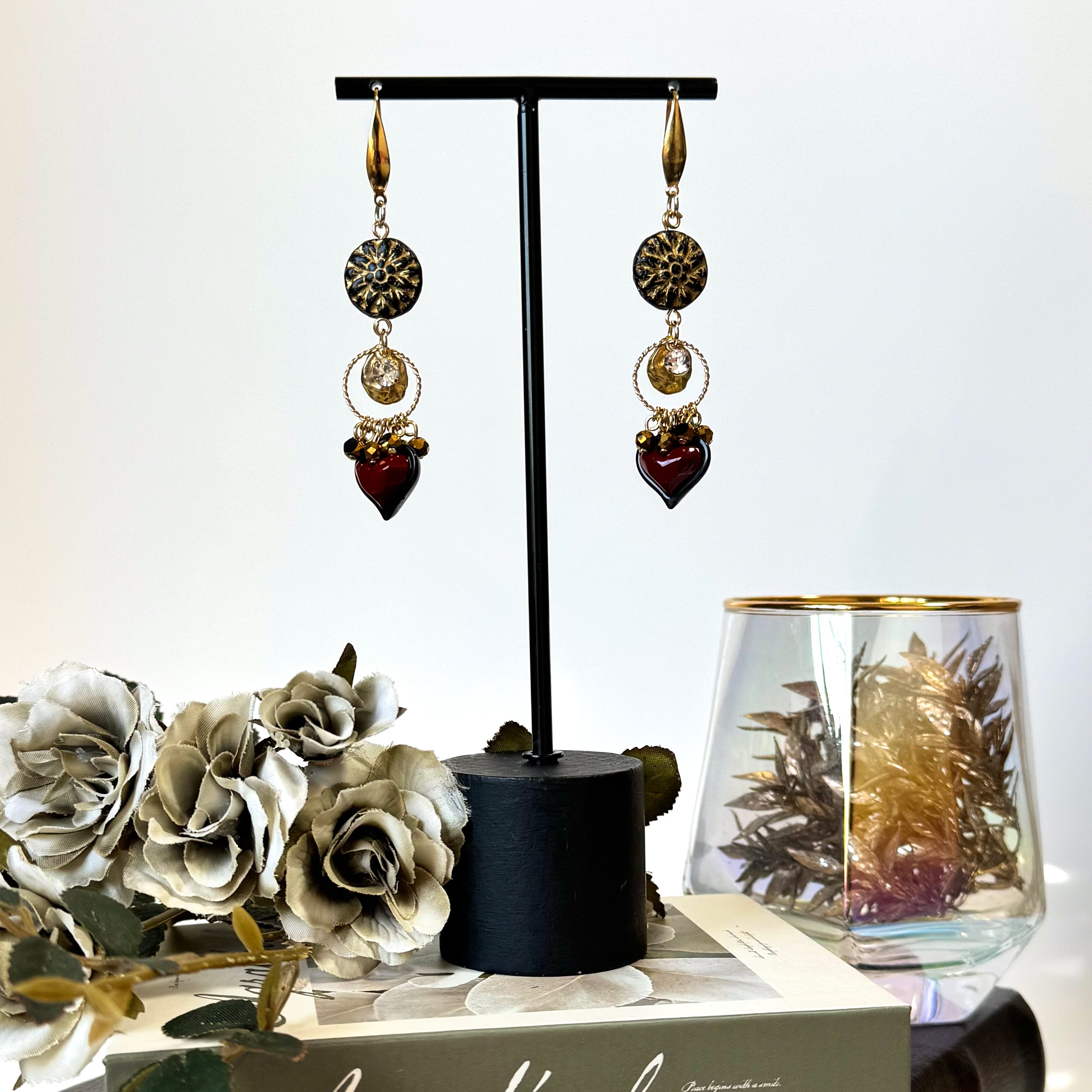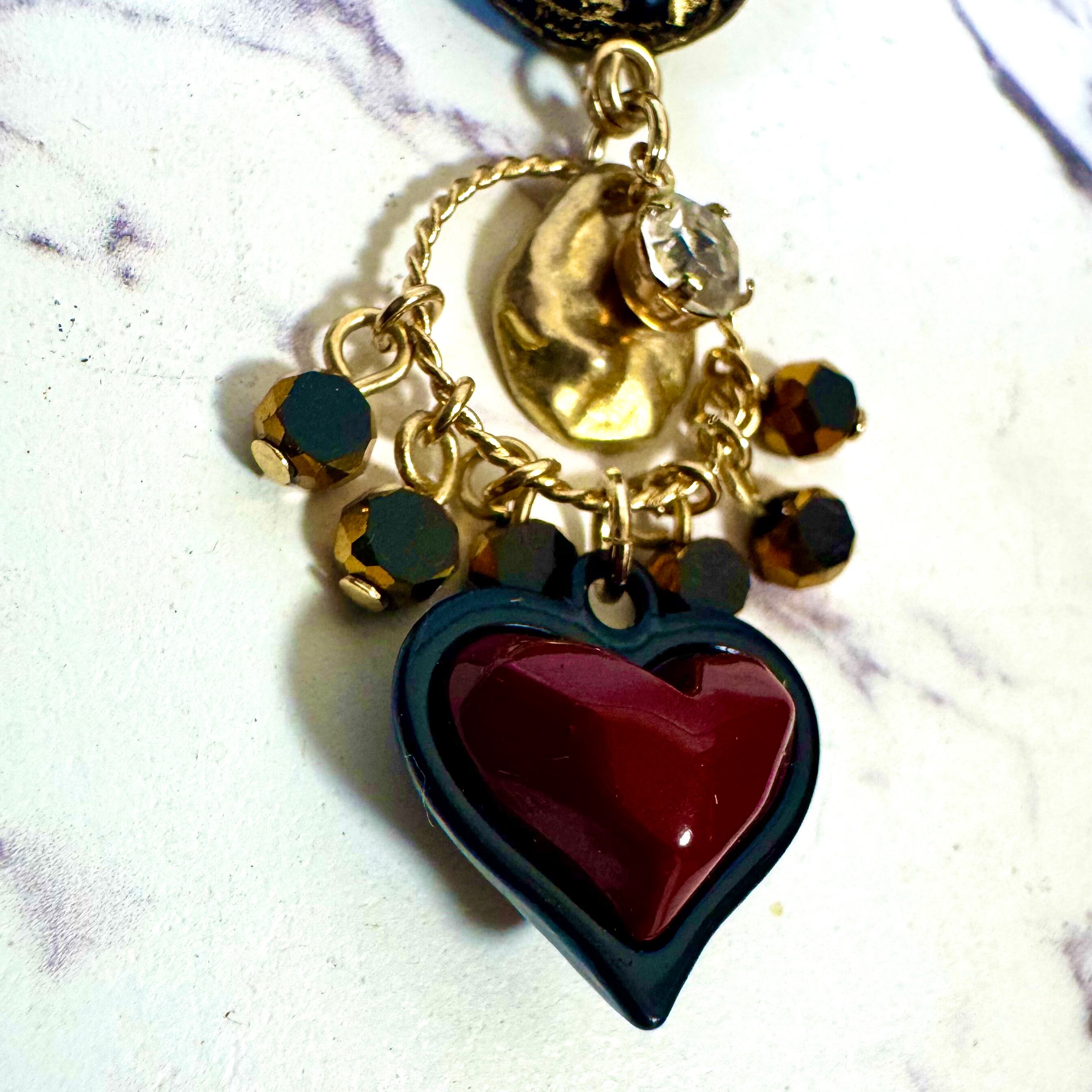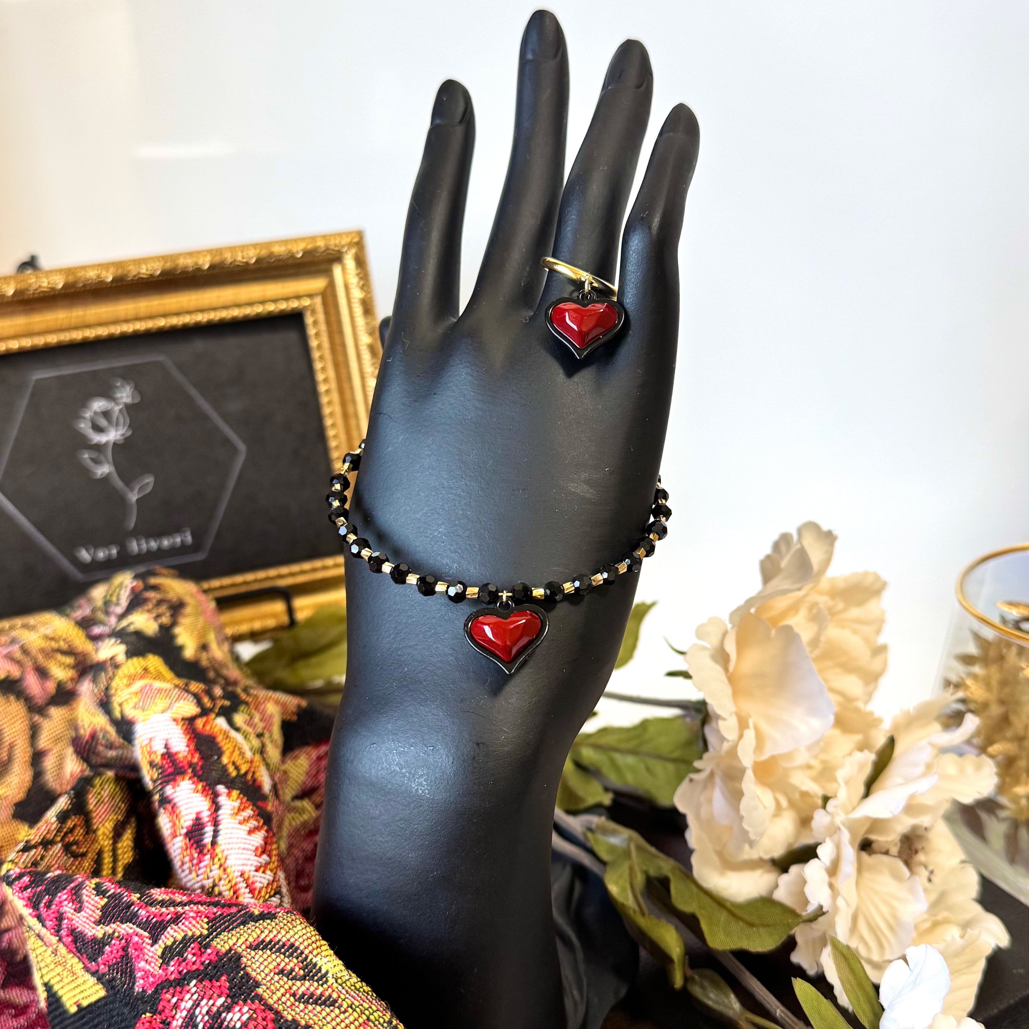 両面で使えるハートチャームを使ったピアス(イヤリング変更可)・ブレスレット・リングの3点セットです。