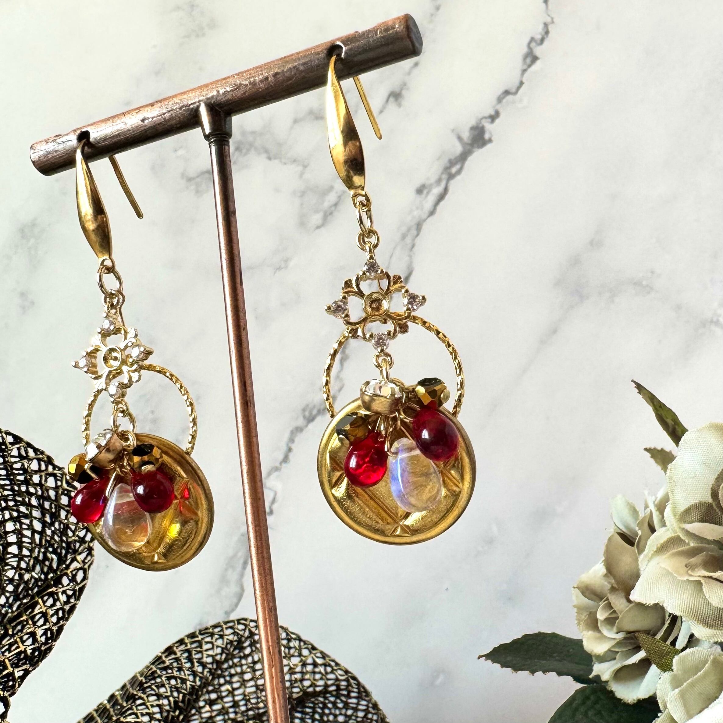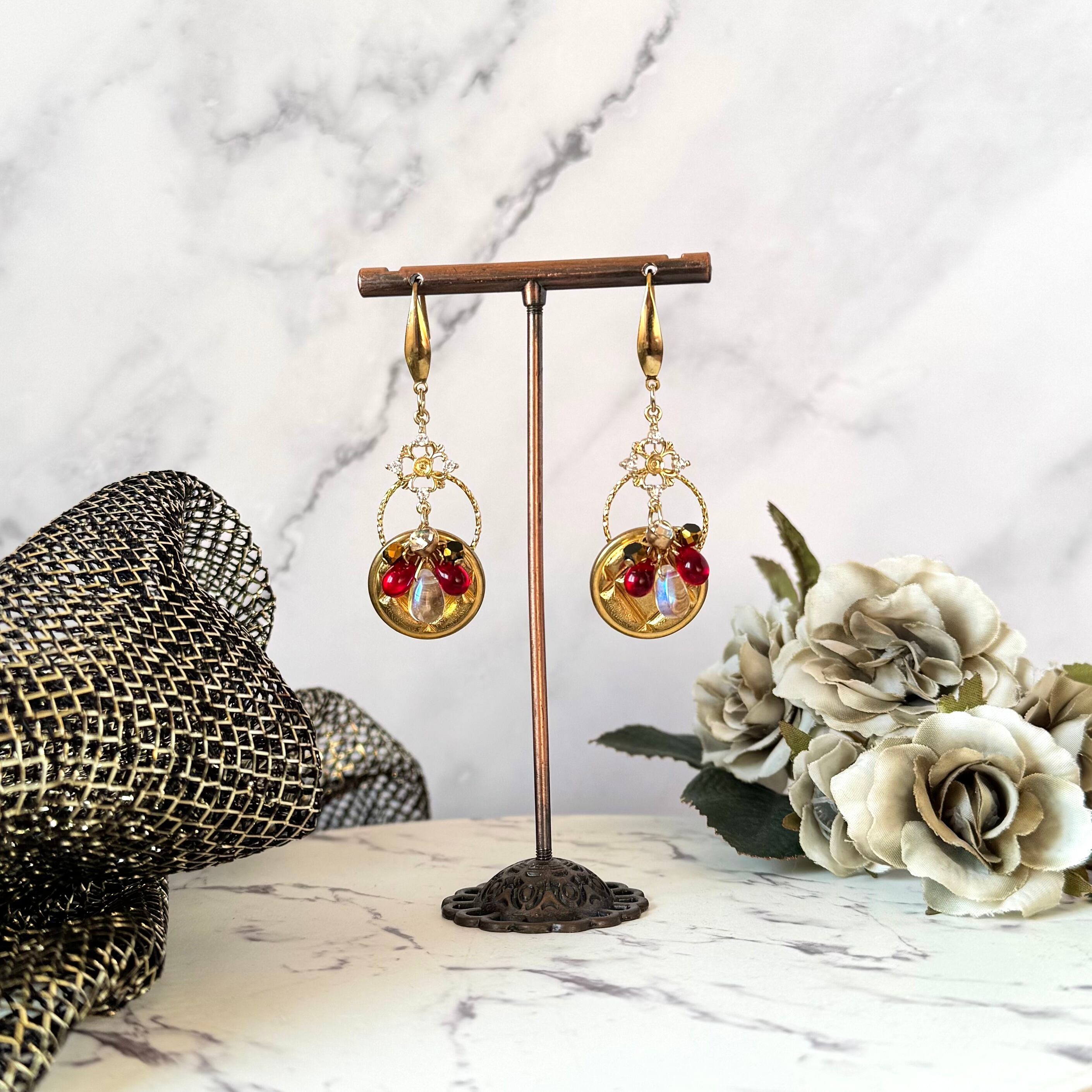 ゴールドの金具に艶やかなドロップビーズとストーン入りのパーツを配置し、様々なきらめきを詰めた作品に仕上げました。