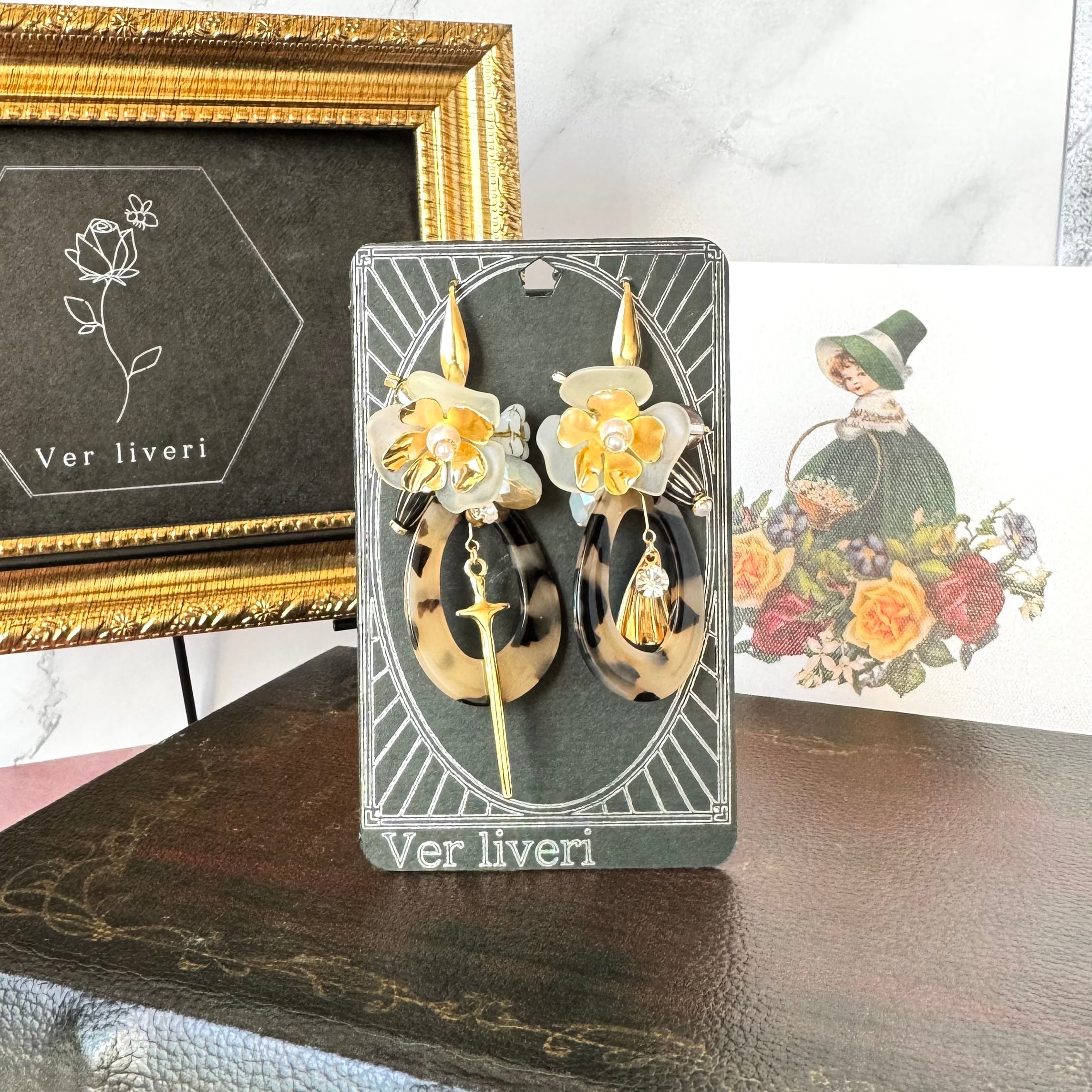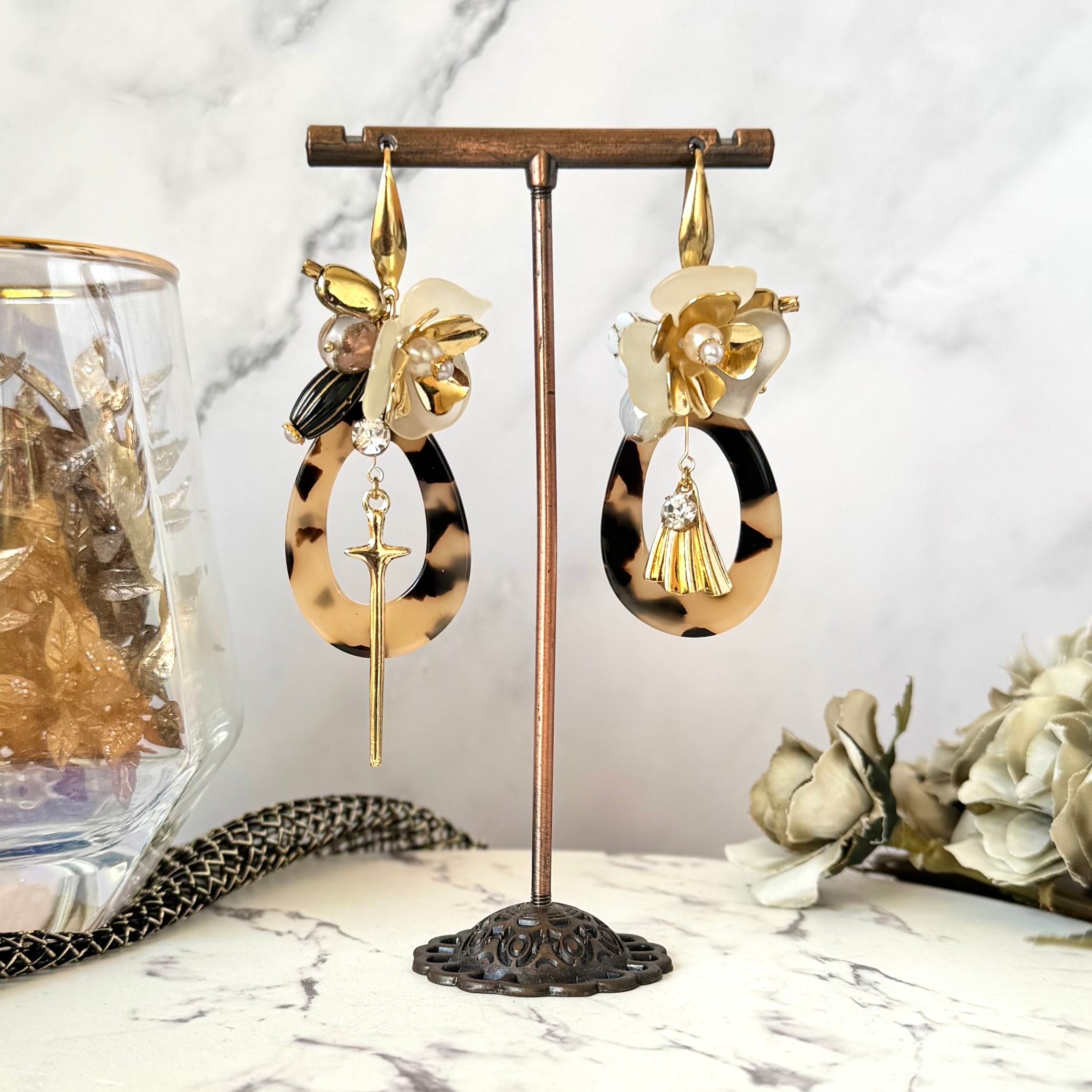 鼈甲風のアクリルパーツにマットホワイトの花とゴールドMIXの花を組み合わせ、クールさと美しさをMIXした作品に仕上げました。