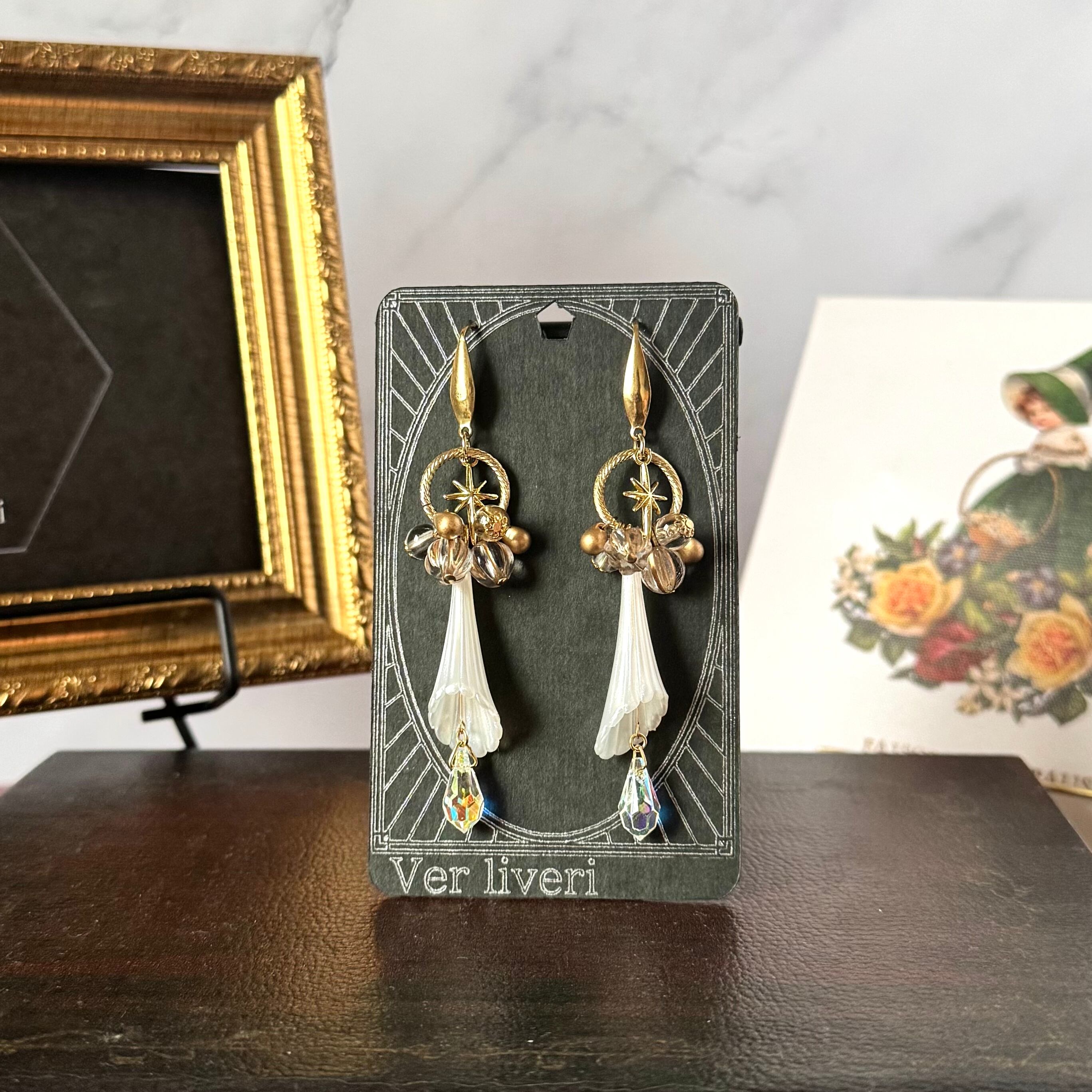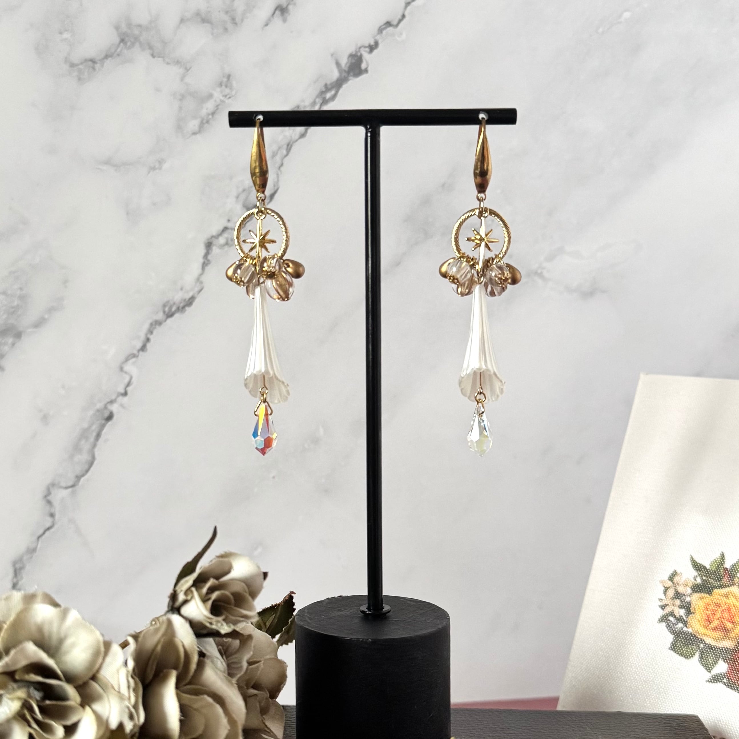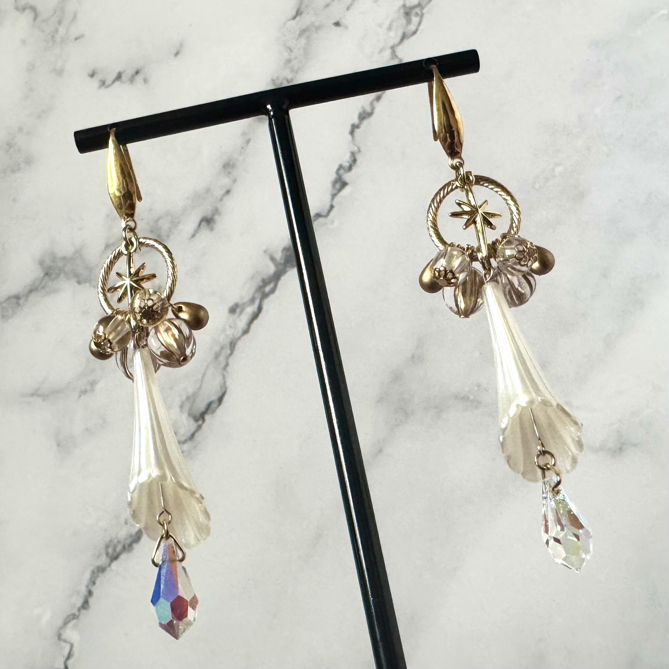 ふわりとした花のアクリルパーツに星やゴールドメインのビーズを組み合わせ神秘的な雰囲気の作品に仕上げました。