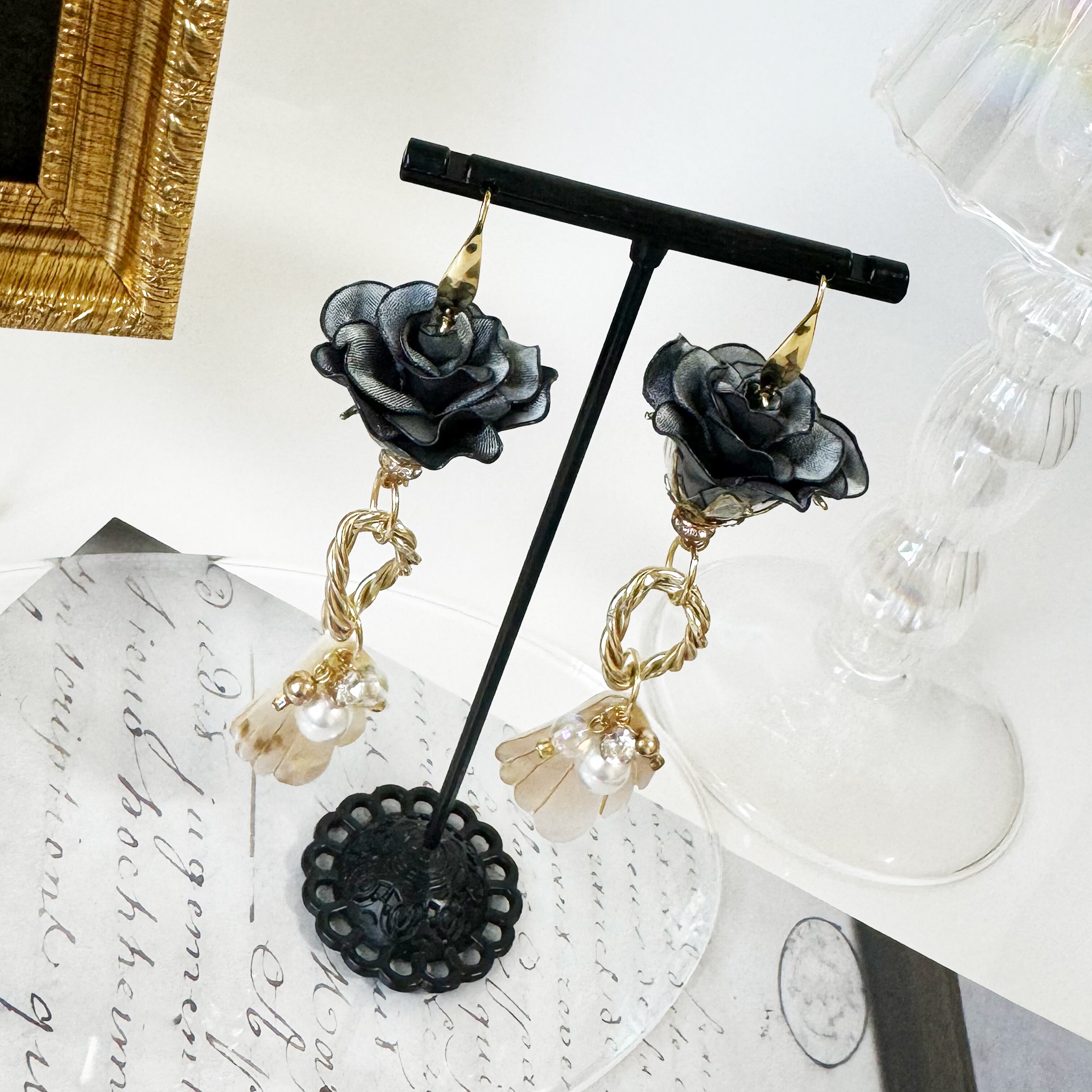 Ver liveriの作家春子が花びら一枚一枚から手作業で作っている薔薇のアクセサリー。
